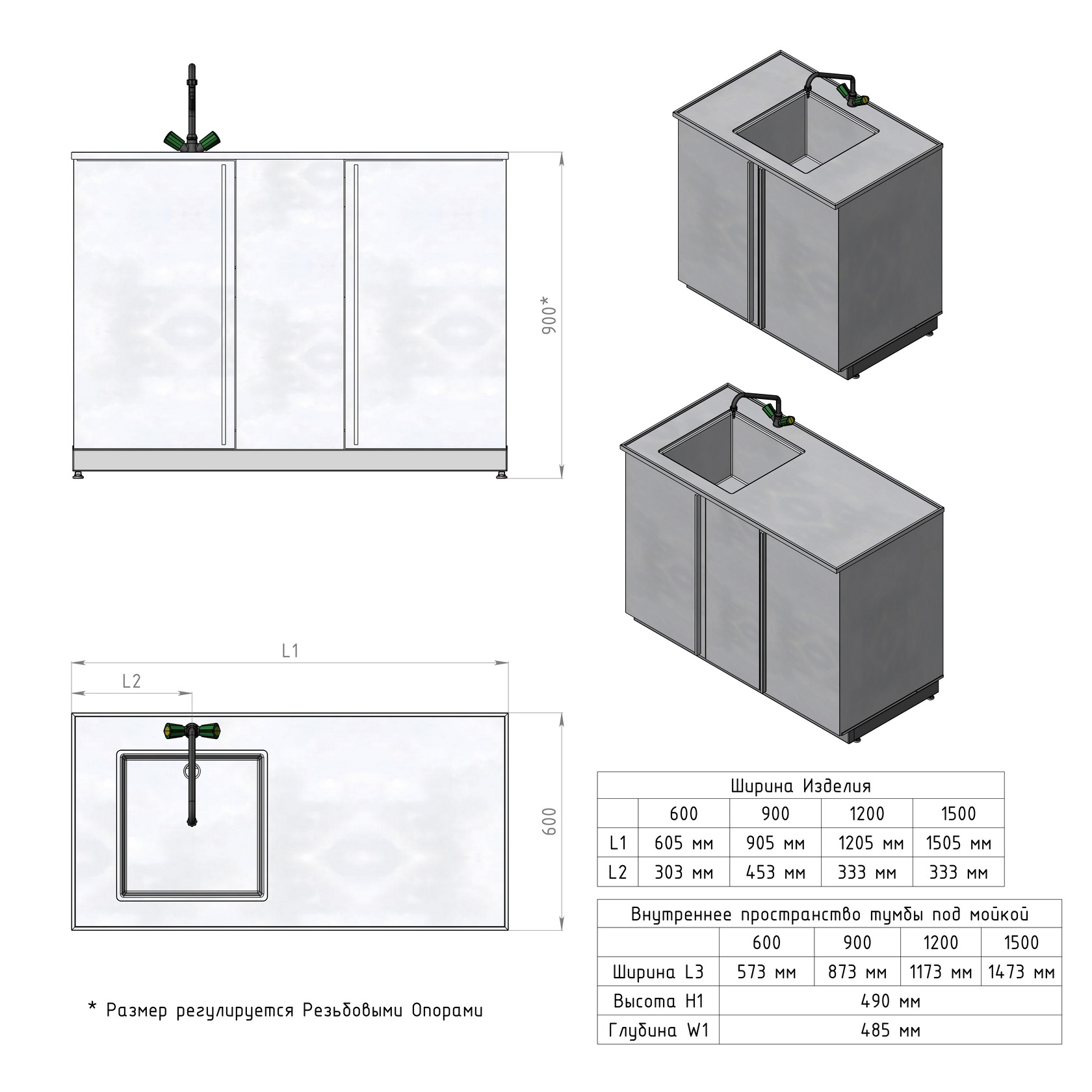 Мойка лабораторная химическая ЛК-1200 СМС-ПВ (2 раковины, 1 смеситель) для посуды устанавливается на прочный металлический сборно-разборный каркас с полимерным покрытием серого цвета.