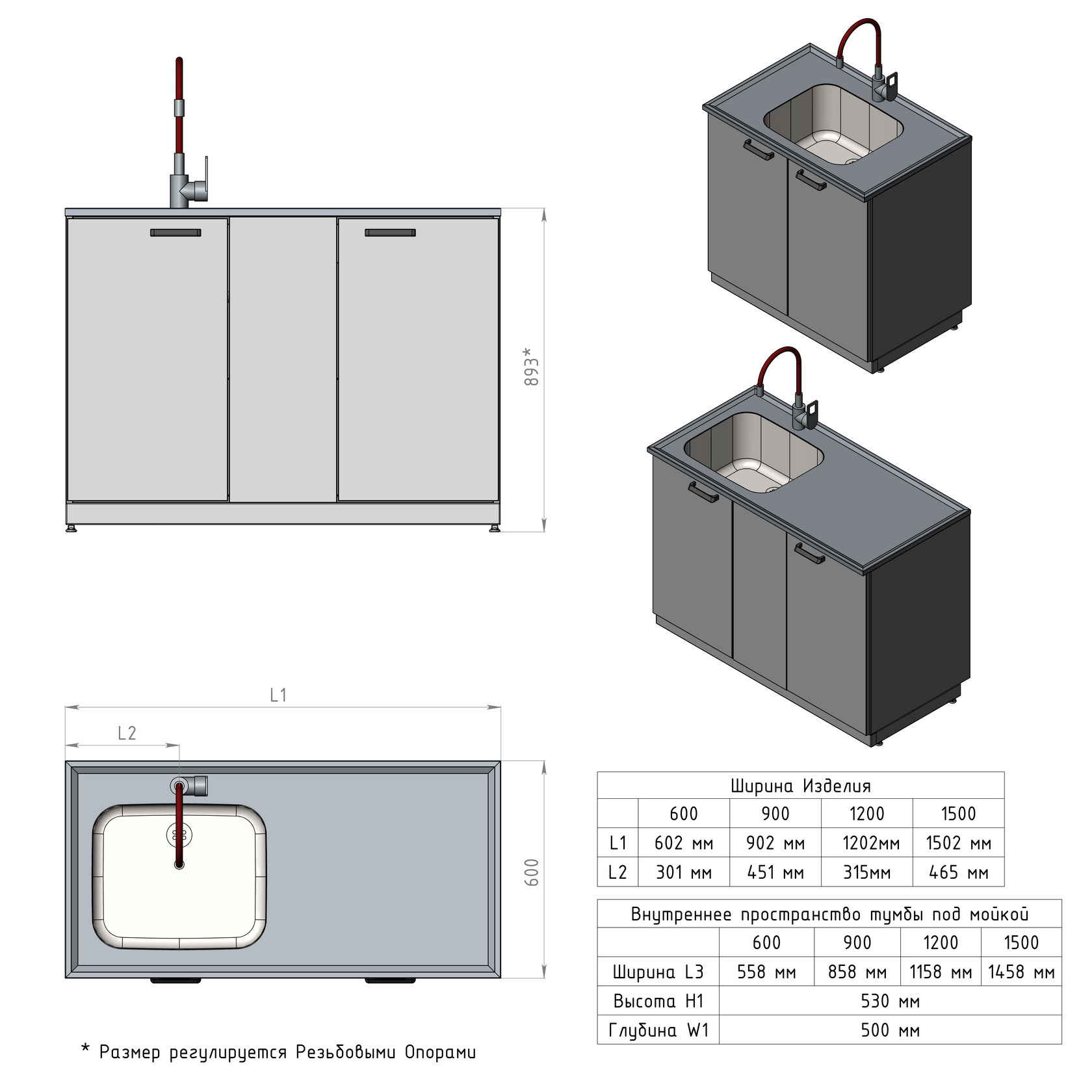 Корпус мойки лабораторной металлической ЛК-1500 СМС-Г (2 раковины, 1 смеситель) может быть выполнен: