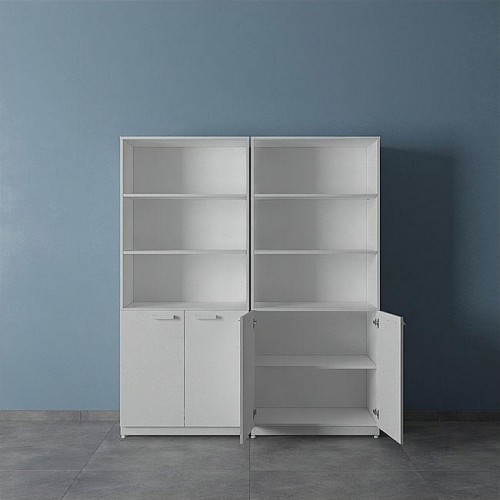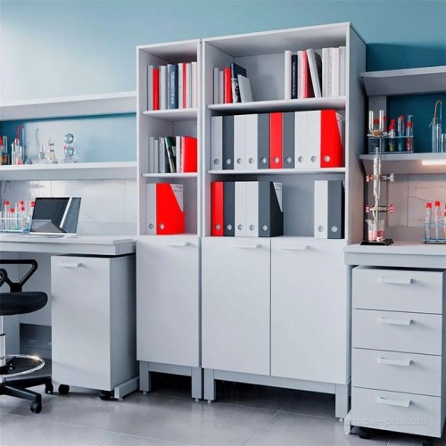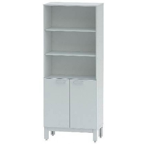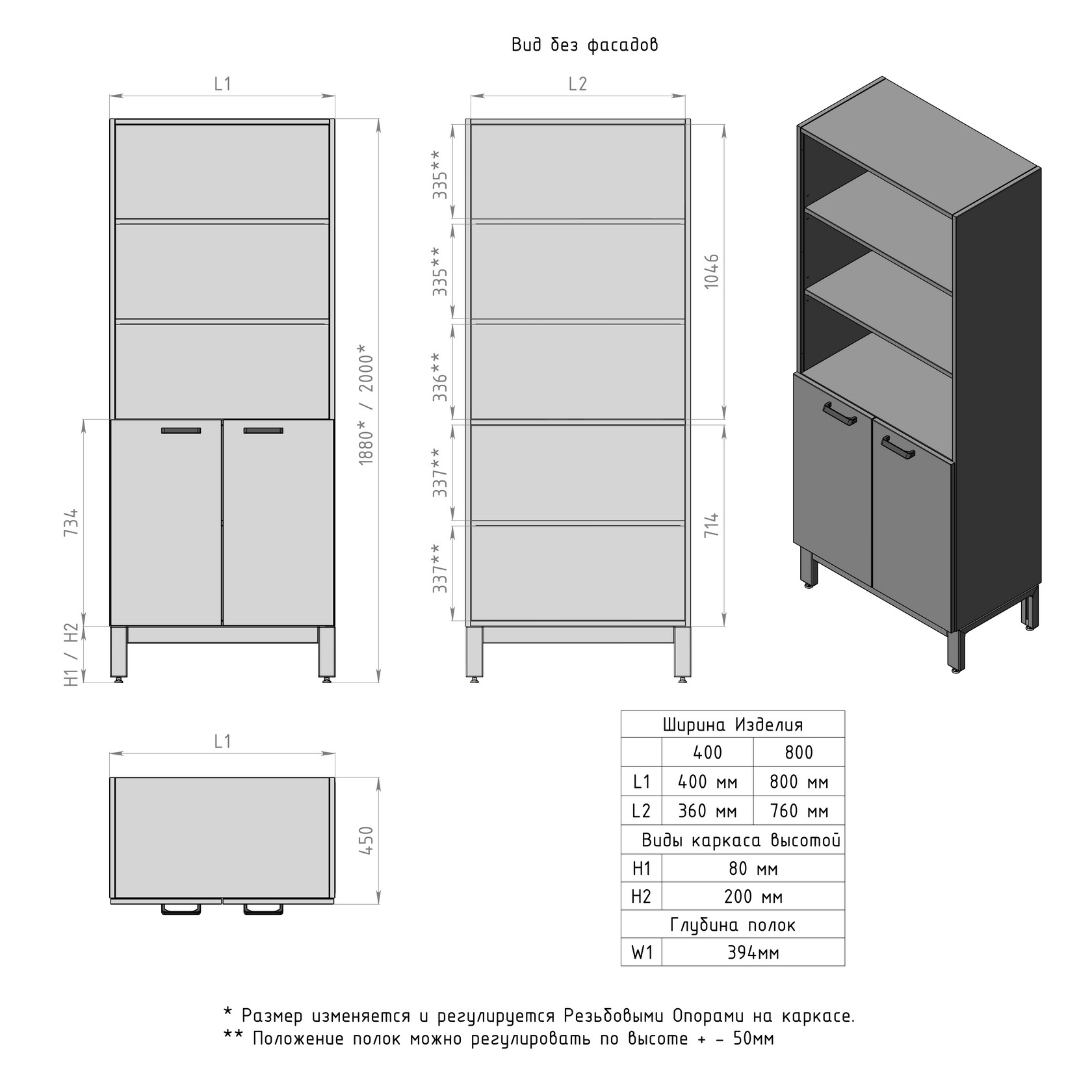 1. Шкаф шириной 800 мм. Имеет две нижние дверки и четыре полки. Устанавливается на металлический каркас с полимерным покрытием серого цвета. Для компенсации неровностей пола в каркасе предусмотрены регулируемые опоры (0-30 мм).