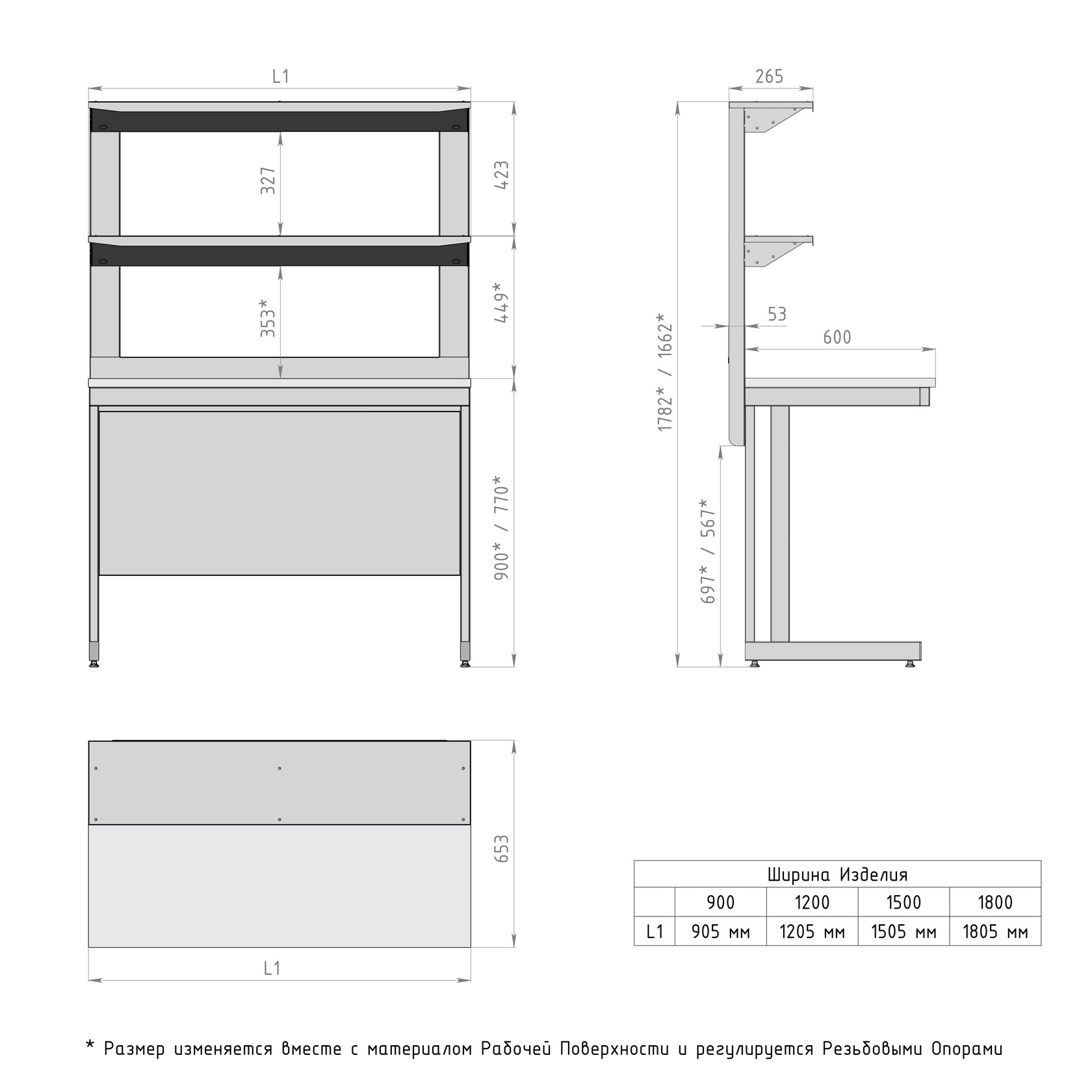 1. Прочный металлический каркас с полимерным покрытием серого цвета; регулируемые опоры 0-30 мм;