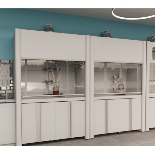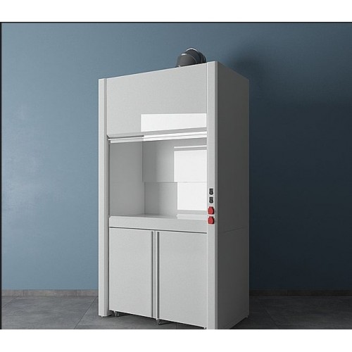 Вытяжная камера шкафа (верхняя часть) изготовлена из монолитного листового полипропилена, который обладает крайне высокой химической стойкостью. Рабочая камера имеет три зоны вытяжки - сверху, посередине и снизу рабочего объёма. Нижняя часть - прочный металлический каркас с полимерным покрытием серого цвета. В каркасе предусмотрены регулируемые опоры в диапазоне 0-30 мм для компенсации неровностей пола.