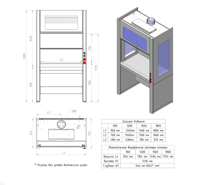 - Вытяжная камера из листовой стали с полимерным покрытием, вставки в корпус из оргстекла;