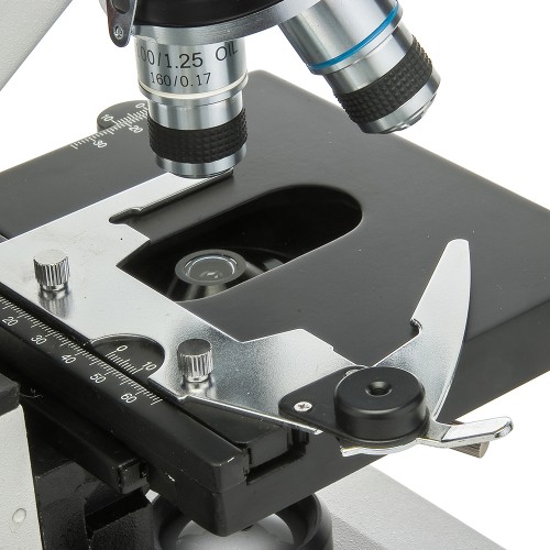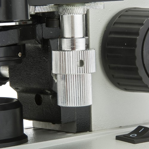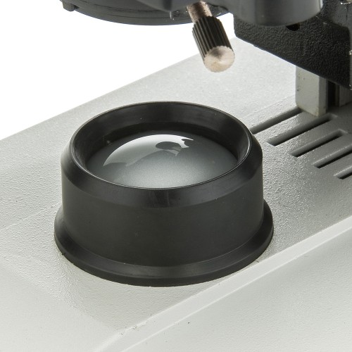 Съемный двухлинзовый конденсор с дополнительной откидной рамкой и ирисовой апертурной диафрагмой обеспечивает освещение полей на объекте при работе с объективами увеличением от 4,0 до 100.