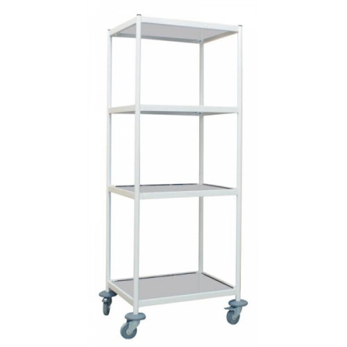 Каркас изготовлен из стального профиля окрашенного экологически чистой полимерно-порошковой краской. Установлен на поворотные колесные опоры диаметром 75 мм, две из которых с тормозом. Колесные опоры самоориентирующиеся, из немаркой серой резины. Четыре съемные полки - из листовой нержавеющей стали толщиной 0,8 мм. Стеллаж имеет разборную конструкцию, может поставлять в разобранном виде.