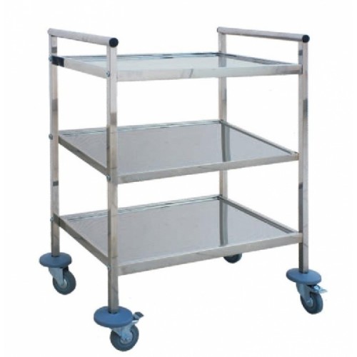 Каркас изготовлен из нержавеющего тонкостенного профиля. Поверхность стола - глянцевая. Установлен на поворотные самоориентирующиеся колеса - 75 мм. Конструкция стола разборная.