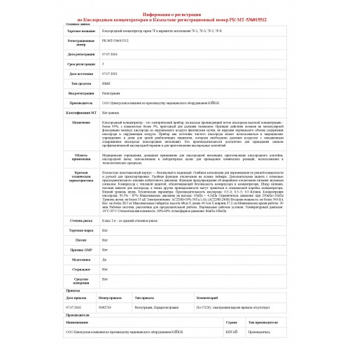 Концентрация кислорода на выходе (при производительности ≥ 1 л/мин): ≥ 93±3%