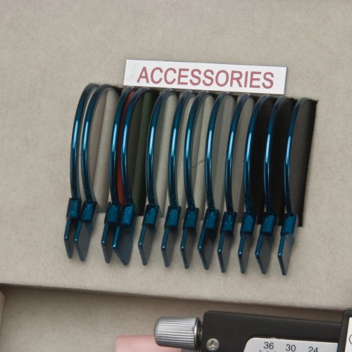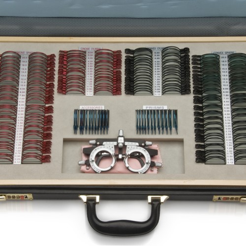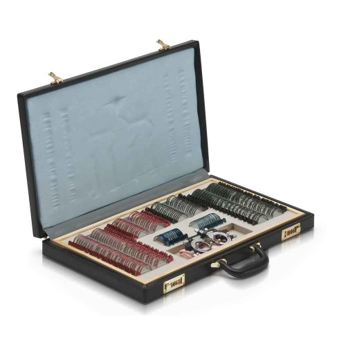 Набор пробных очковых линз укомплектован пробной универсальной оправой ОПУ и поставляется в кожаном чемодане.