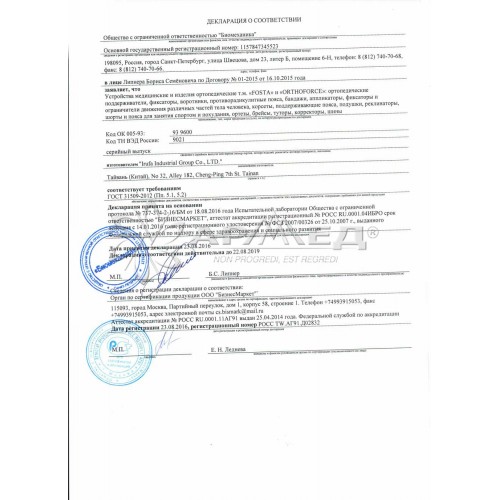 Корсет содержит 4 упругих металлических продольных ребра жесткости и систему застежек, позволяющую дозировать и распределять необходимую фиксацию и разгрузку нижне-грудного, поясничного и пояснично-крестцового отделов позвоночника.