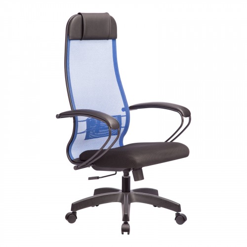 - синяя спинка с черными накладками подлокотника и черным сиденьем;