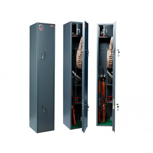 отделением, запирающимся на ключ, полками и ложементами для ружей комплектуется двумя ключевыми замками наличие анкерных отверстий для крепления сейфа к стене * линейный размер от поверхности дна до патронного