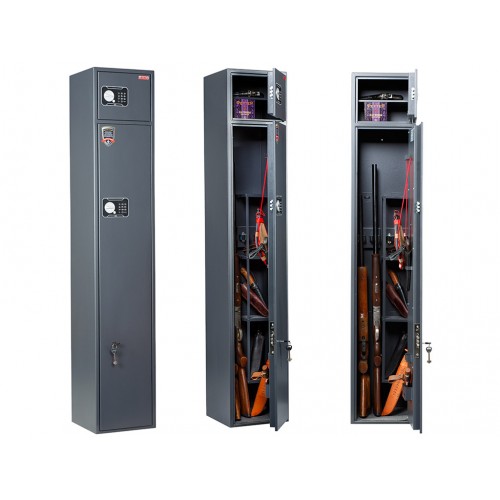 отделением, запирающимся на ключ, полками и ложементами для ружей комплектуется двумя электронными замками + ключевой наличие анкерных отверстий для крепления сейфа к стене