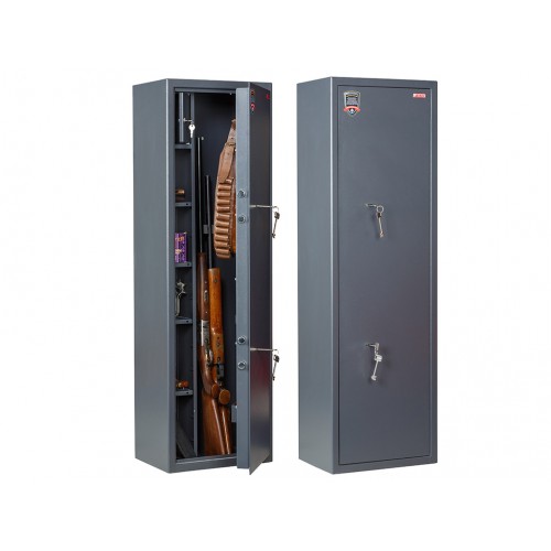 • толщина металла корпуса и двери – 3 мм оборудованы патронным отделением, запирающимся на ключ, полками и ложементами для ружей