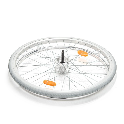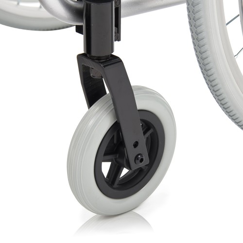 Кресло-коляска оснащена колесами, имеющими пневматические или цельнолитые задние и передние цельнолитые шины.